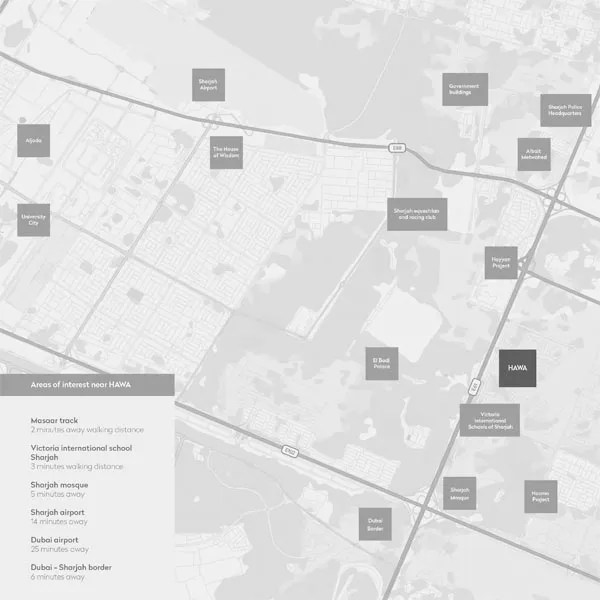 The master plan of Hawa Residences at Tilal City is centered around a community-driven layout that blends modern living with tranquil surroundings, creating a balanced residential environment. The development is thoughtfully arranged across four low-rise levels, anchored by three expansive landscaped courtyards that introduce greenery, water features, and open-air relaxation zones at the heart of the project. Pedestrian-friendly pathways and well-designed promenades connect residential spaces with lifestyle amenities such as a swimming pool, children’s play area, zen garden, and integrated retail outlets, fostering both convenience and social interaction. The strategic positioning of the project ensures seamless connectivity to major road networks, enabling easy access to key destinations including educational hubs, airports, and neighboring emirates, while nearby schools, mosques, and daily retail facilities further enhance the overall living experience.