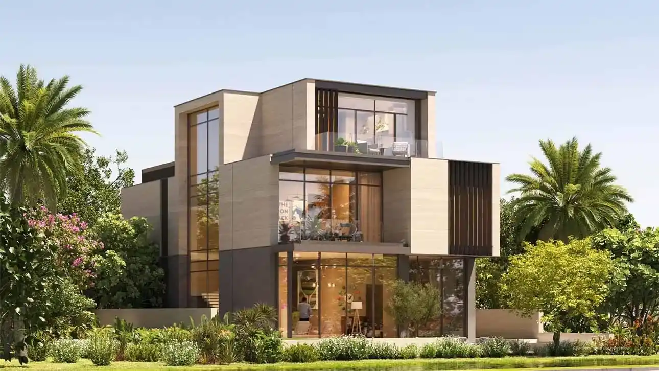 Each RAIHA villa spans a generous total area of 5,053.87 sq. ft. across three floors, offering six spacious bedrooms with en-suite bathrooms, walk-in showers, and built-in wardrobes. The ground floor includes both driver and maid rooms, along with separate entrances for service and guests. An open-plan living and dining area is enhanced by glazed façades that provide seamless views of the landscaped gardens, while a large external lounge, accessed via sliding doors, extends the living space outdoors. A dedicated lift ensures ease of movement between floors, and private parking accommodates up to three vehicles.