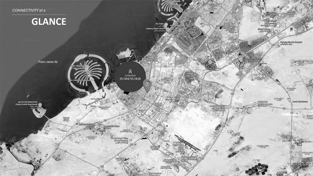 The master plan of SAMANA Business Hub places it at the heart of Downtown Jebel Ali, a visionary corridor designed to blend commercial strength with urban convenience along Sheikh Zayed Road. This expansive district is thoughtfully organized with a mix of business zones, residential communities, and retail avenues, all connected through landscaped streets and pedestrian-friendly pathways. Its proximity to key destinations such as Jebel Ali Free Zone, Dubai Investments Park, and Expo City Dubai enhances its appeal, creating a dynamic environment where global trade, logistics, and corporate enterprises thrive within a rapidly developing economic hub.